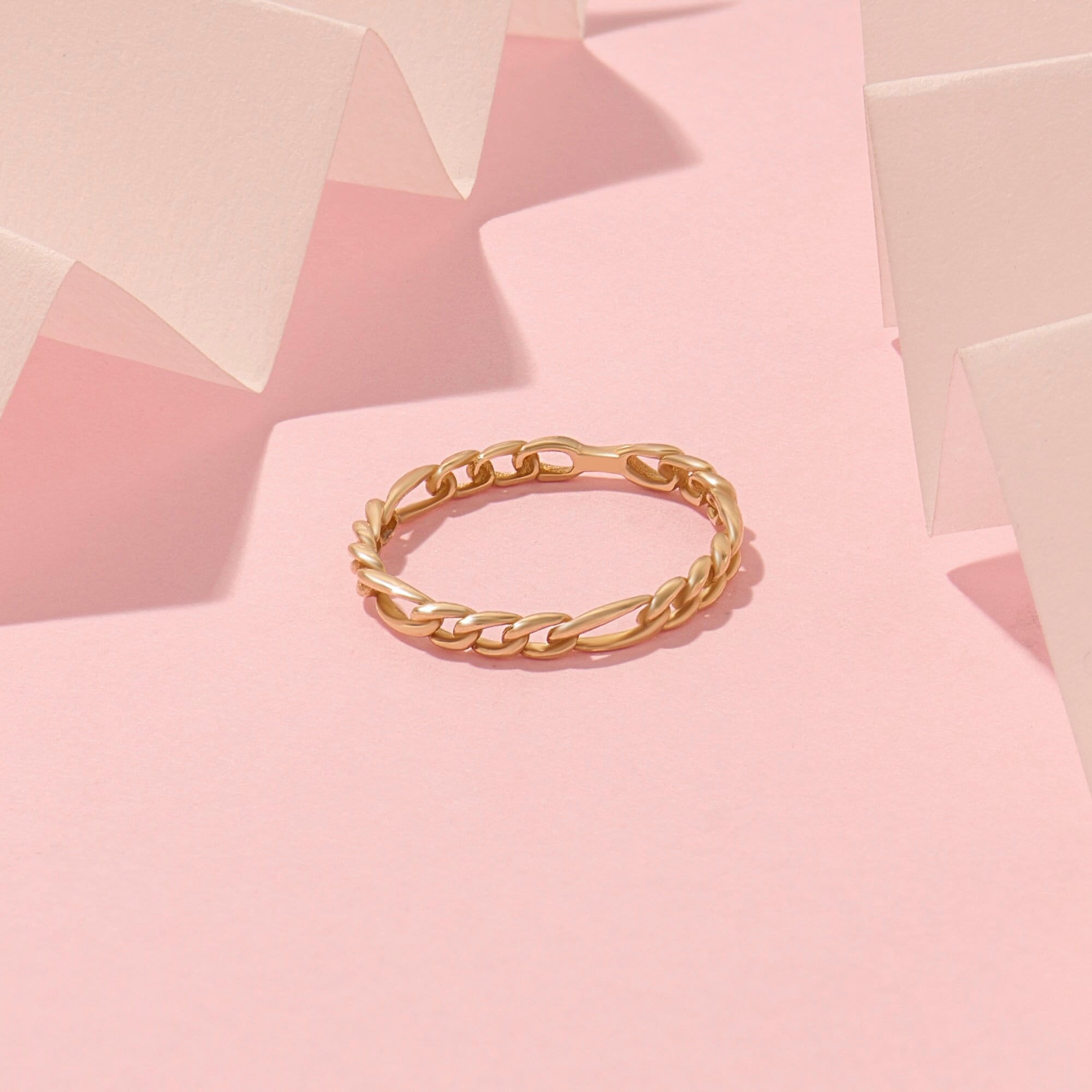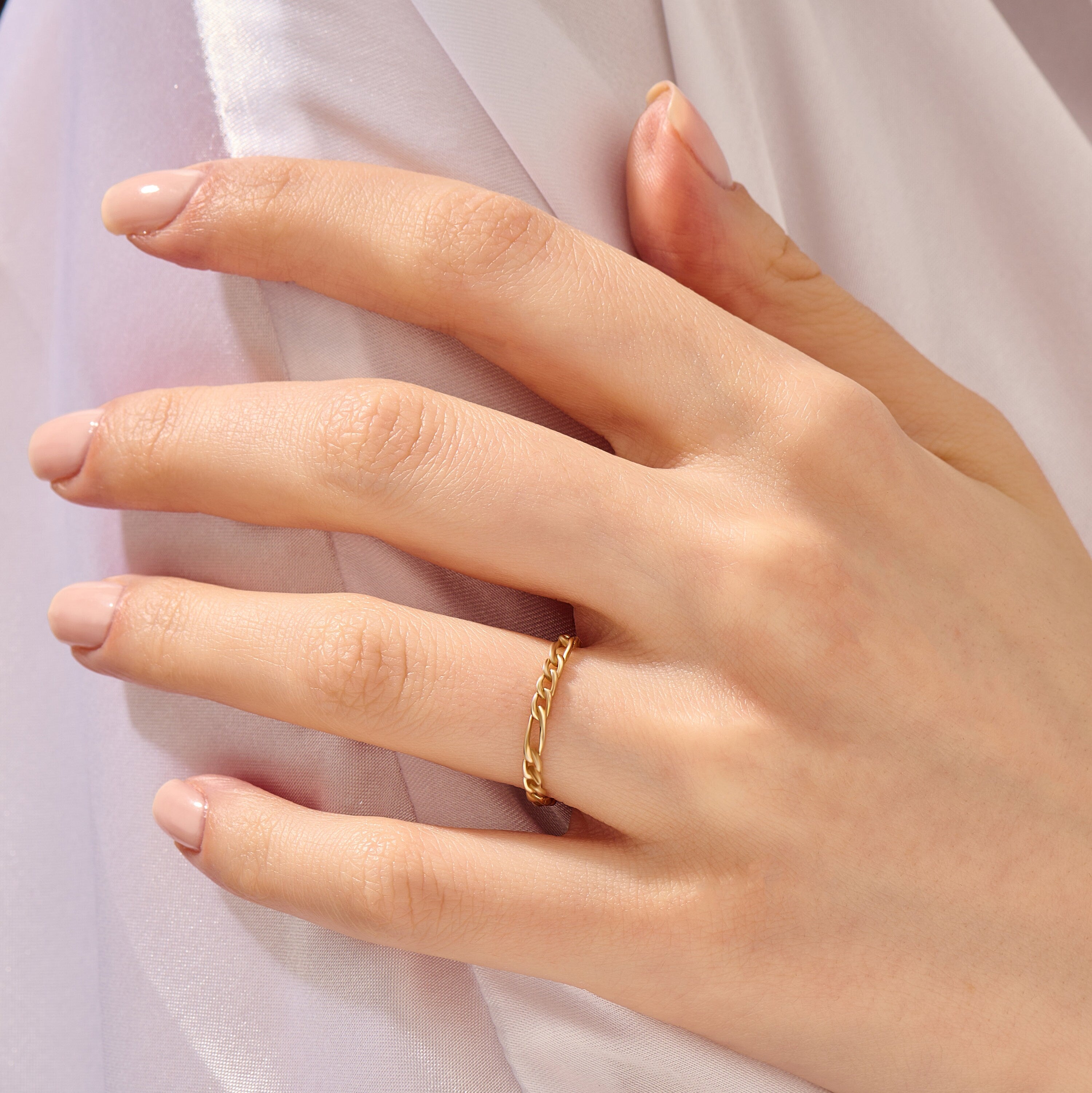 Minimalism meets texture with this 14k solid gold Figaro chain ring. Unlike flat bands, its 3D link design adds a tiny “lift” to your finger—each Figaro link is smoothly forged, so there are no rough edges (just comfortable, all-day wear). The Cuban link-inspired thickness gives it a satisfying “weight” (no flimsy feel!) while keeping the silhouette delicate enough for midi or pinky wear. Hand-finished solid gold means it ages gracefully—no fading, no discoloration—and the neutral design works with casual tees or cocktail dresses alike. It’s the kind of ring that feels intentional: small enough to be understated, but unique enough to get “where’d you get that?''