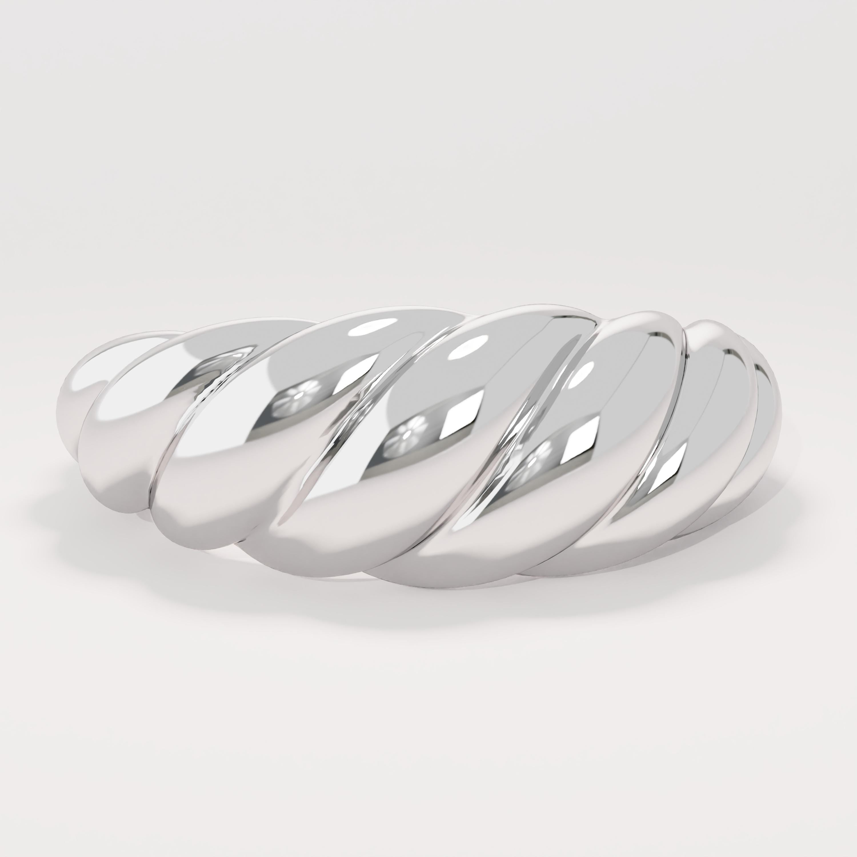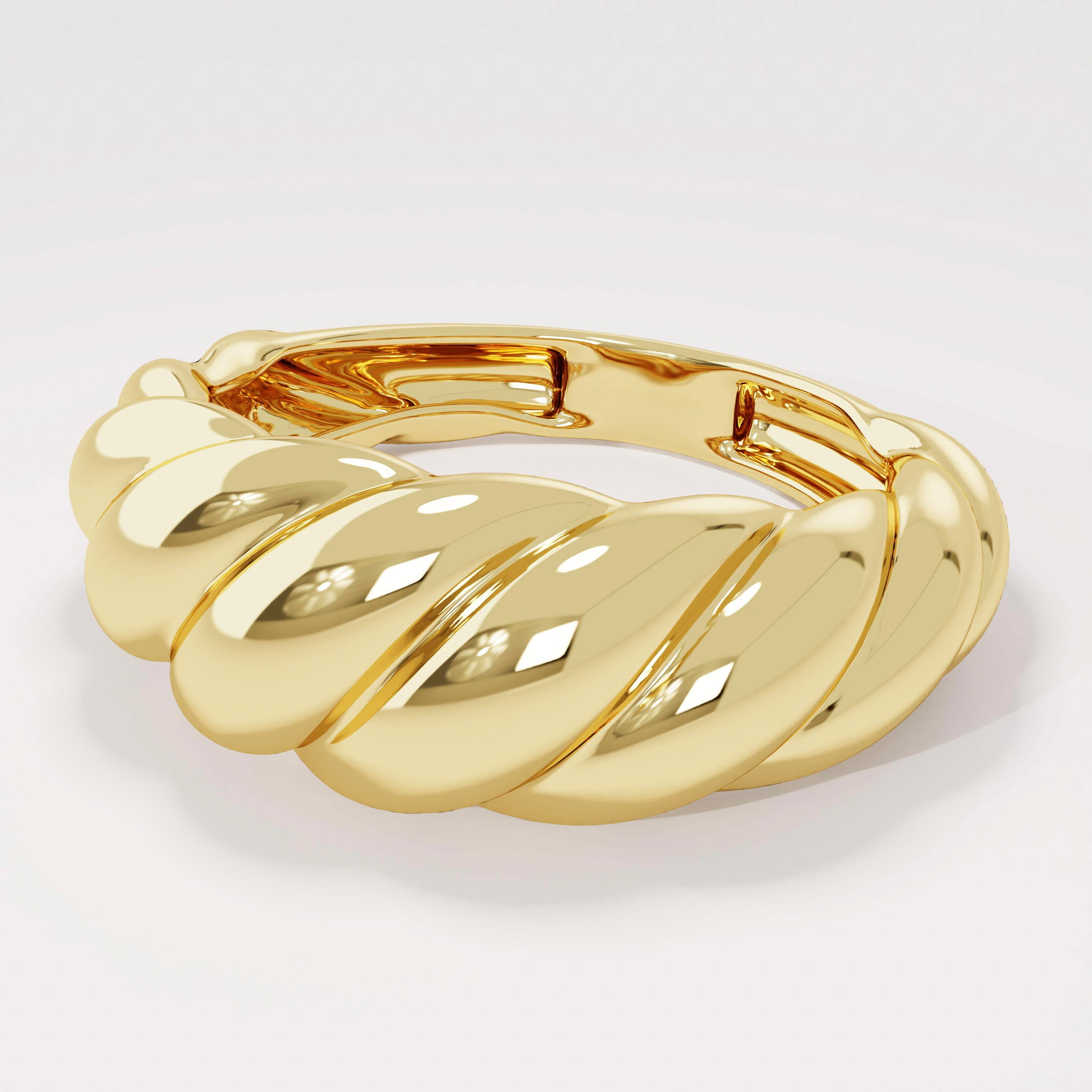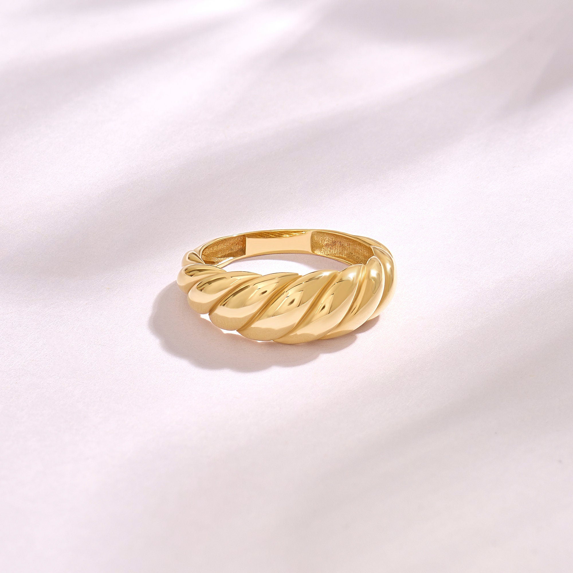 Design: Unique curved dome silhouette + textured twisted rope band (distinctive shape with subtle dimension; smooth polished finish for warm shine)