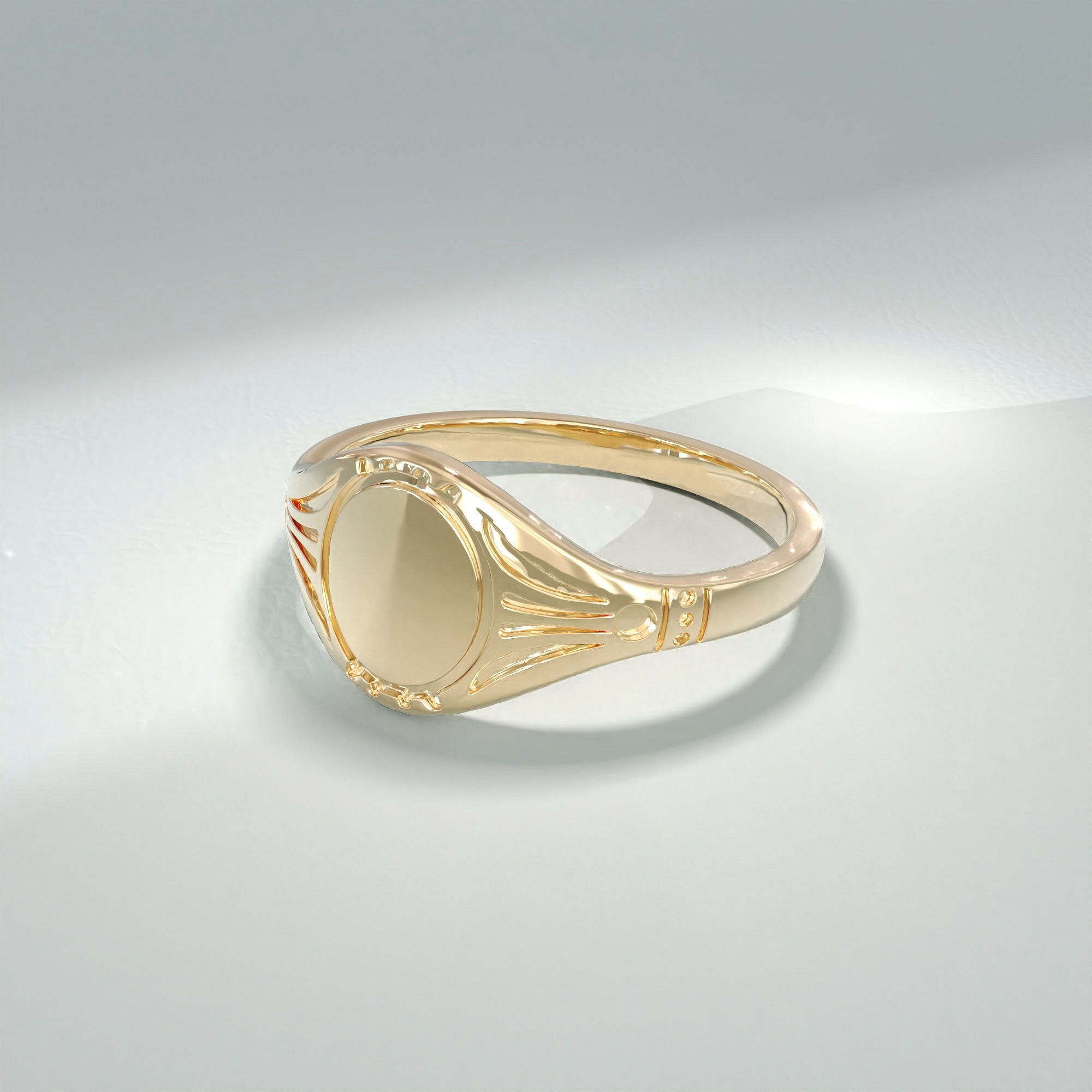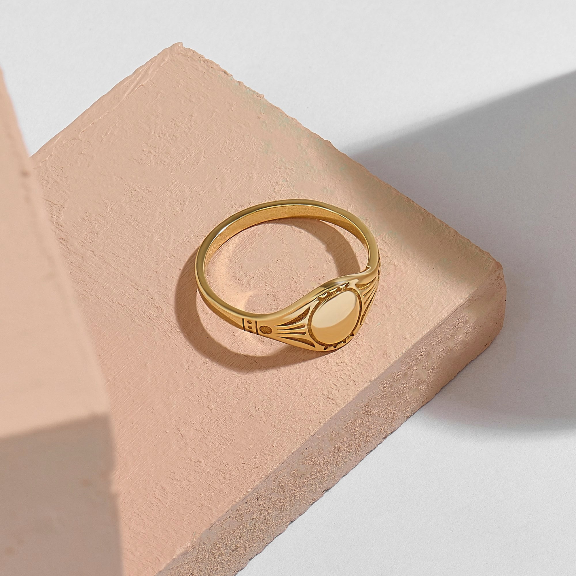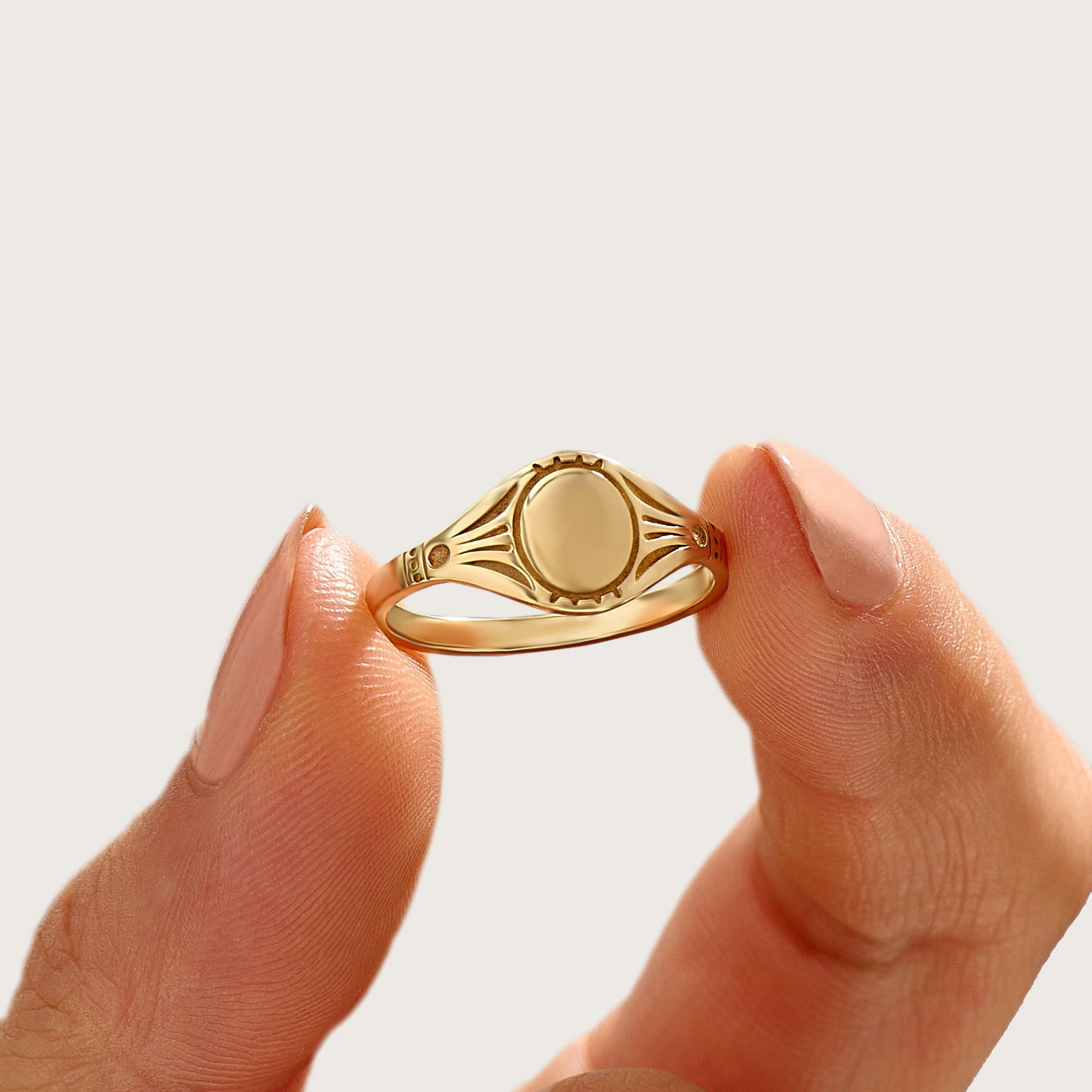 Its compact size and refined weight make it ideal as a pinky ring—adding a touch of understated flair to everyday looks, whether paired with casual denim or elegant dresses. The 14k solid gold construction ensures durability, with a finish that ages gracefully, developing a soft patina over time that enhances its vintage character.