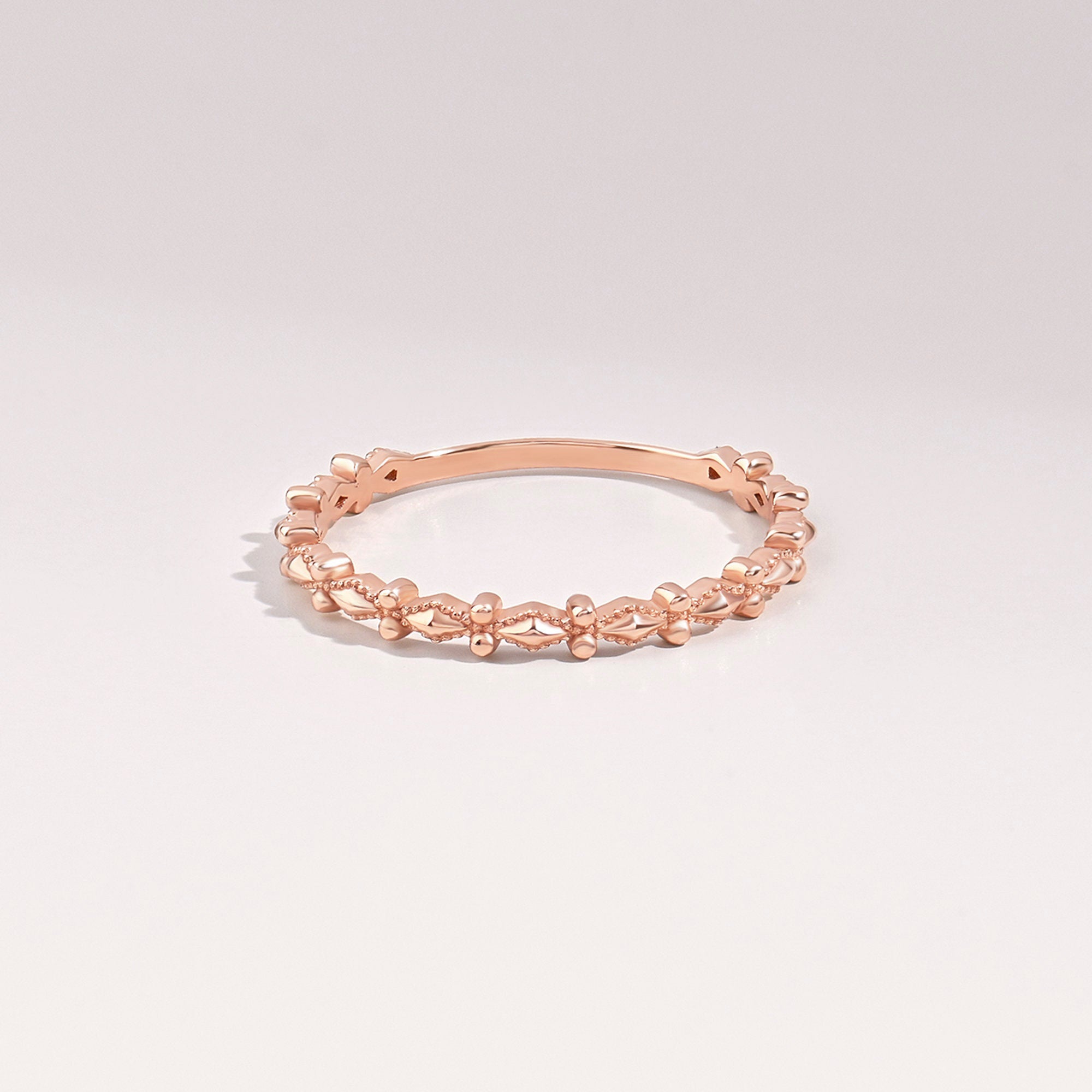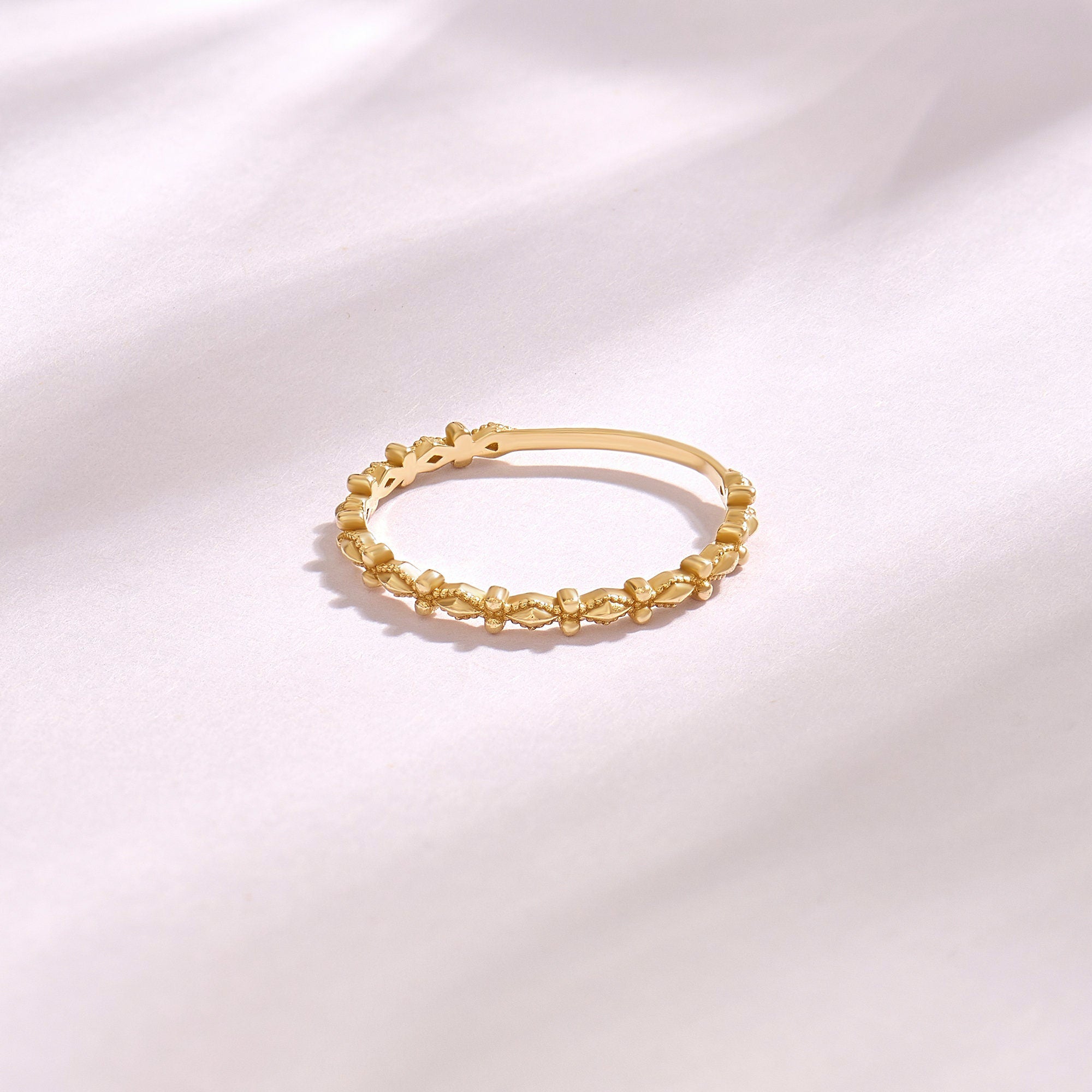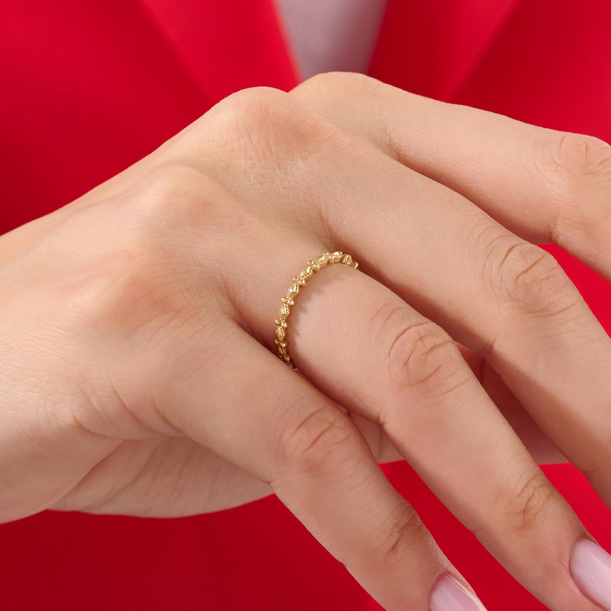 This 14k solid gold band blends Art Deco glamour with dainty wearability. Delicate hand-pierced milgrain edges (a 1920s signature) add vintage texture, while the slim profile feels modern. Perfect for brides who love classic charm—stackable with engagement rings or stunning alone as a love symbol.