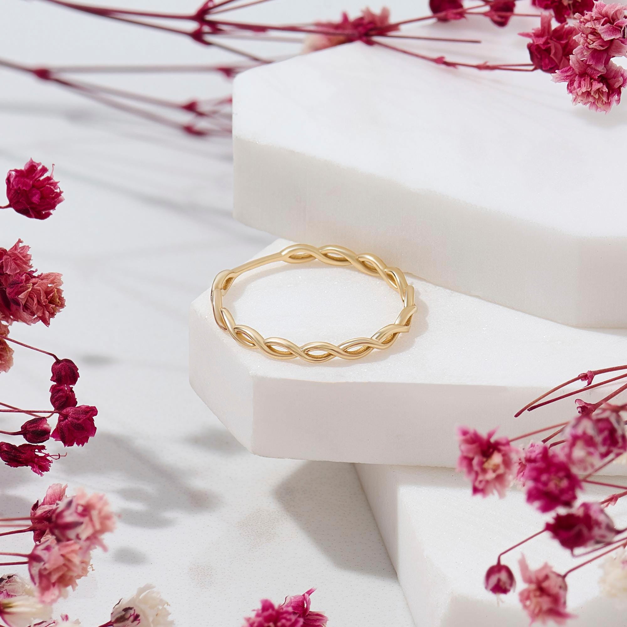 Design: Subtle twisted motif on a dainty thin band (minimalist spiral texture adds gentle dimension; slim profile keeps the look understated; polished finish enhances the twist’s delicate curve)