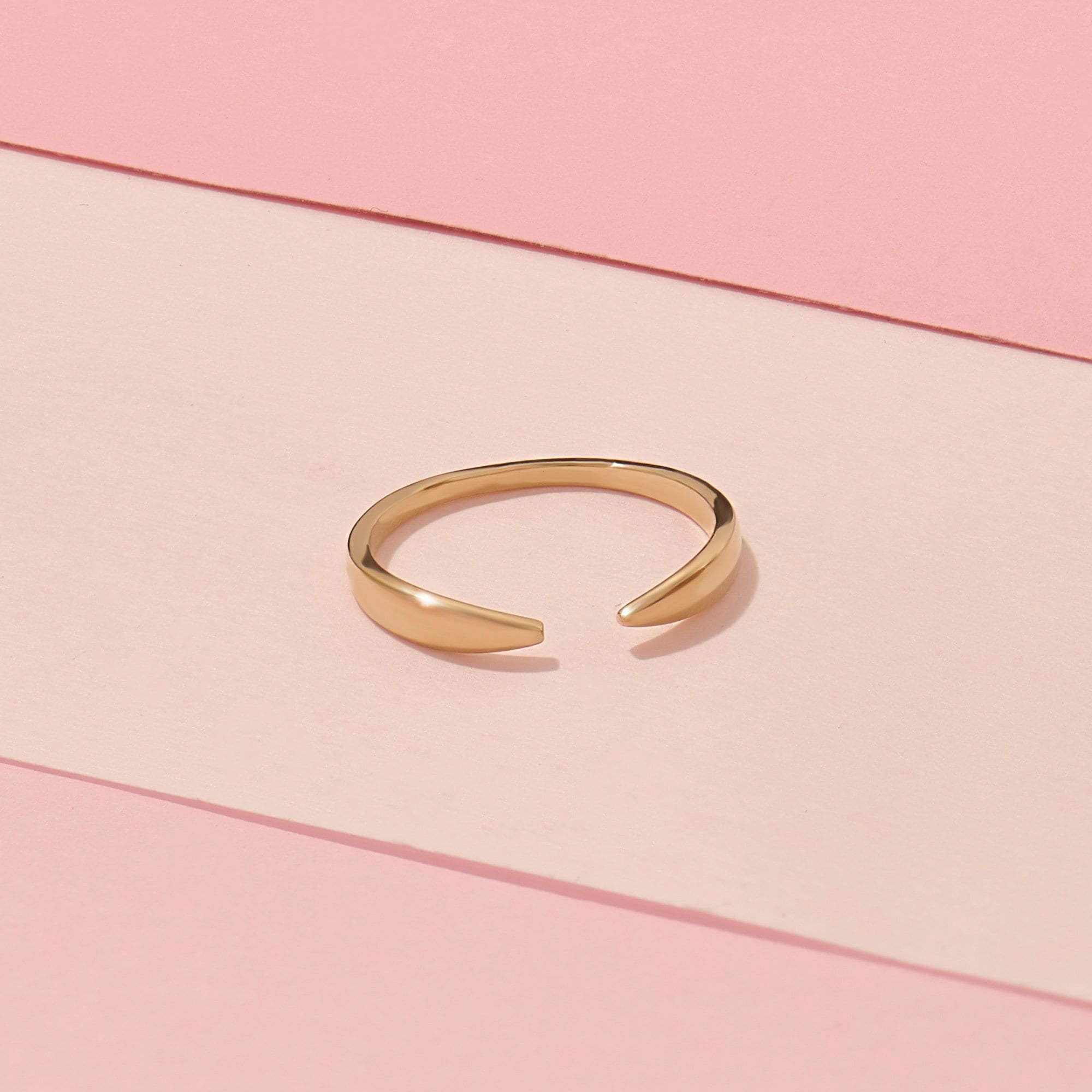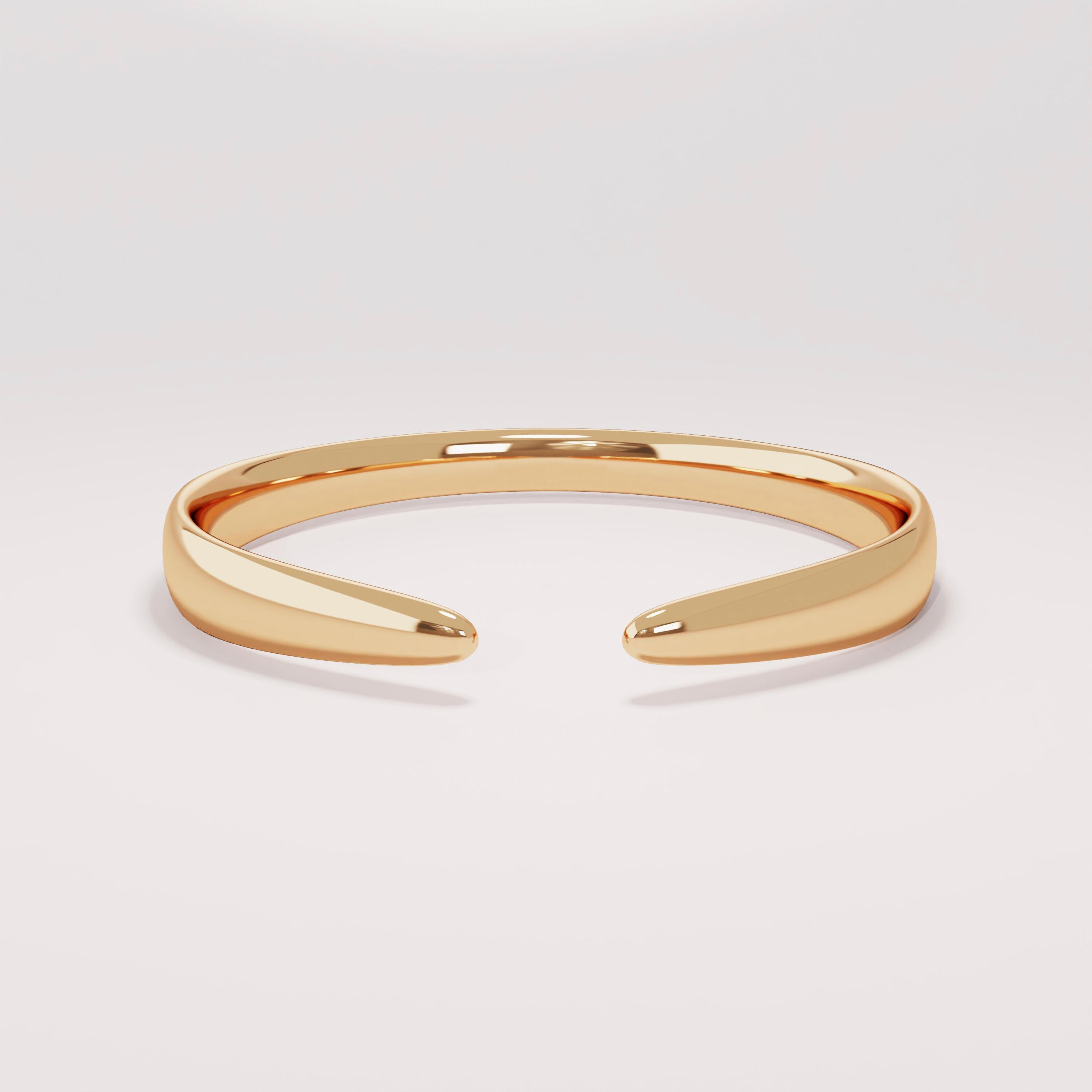 Design: Delicate open band with subtle claw-like curves (wrap-style silhouette that complements solitaire engagement rings; slim profile keeps the look dainty; polished finish highlights the gold’s natural shine)