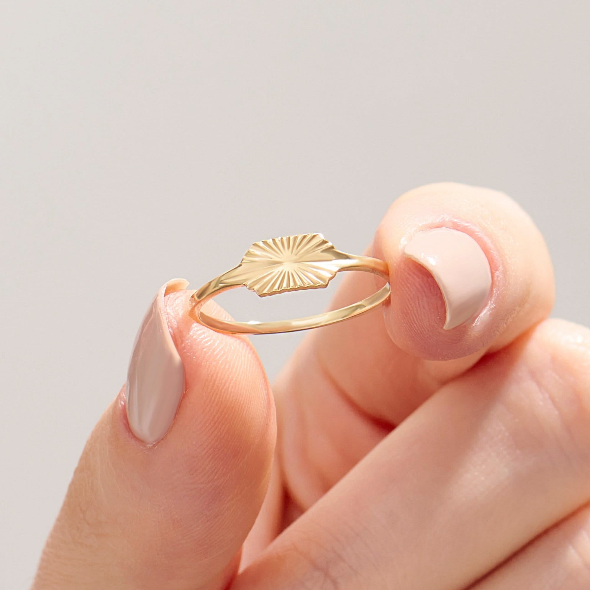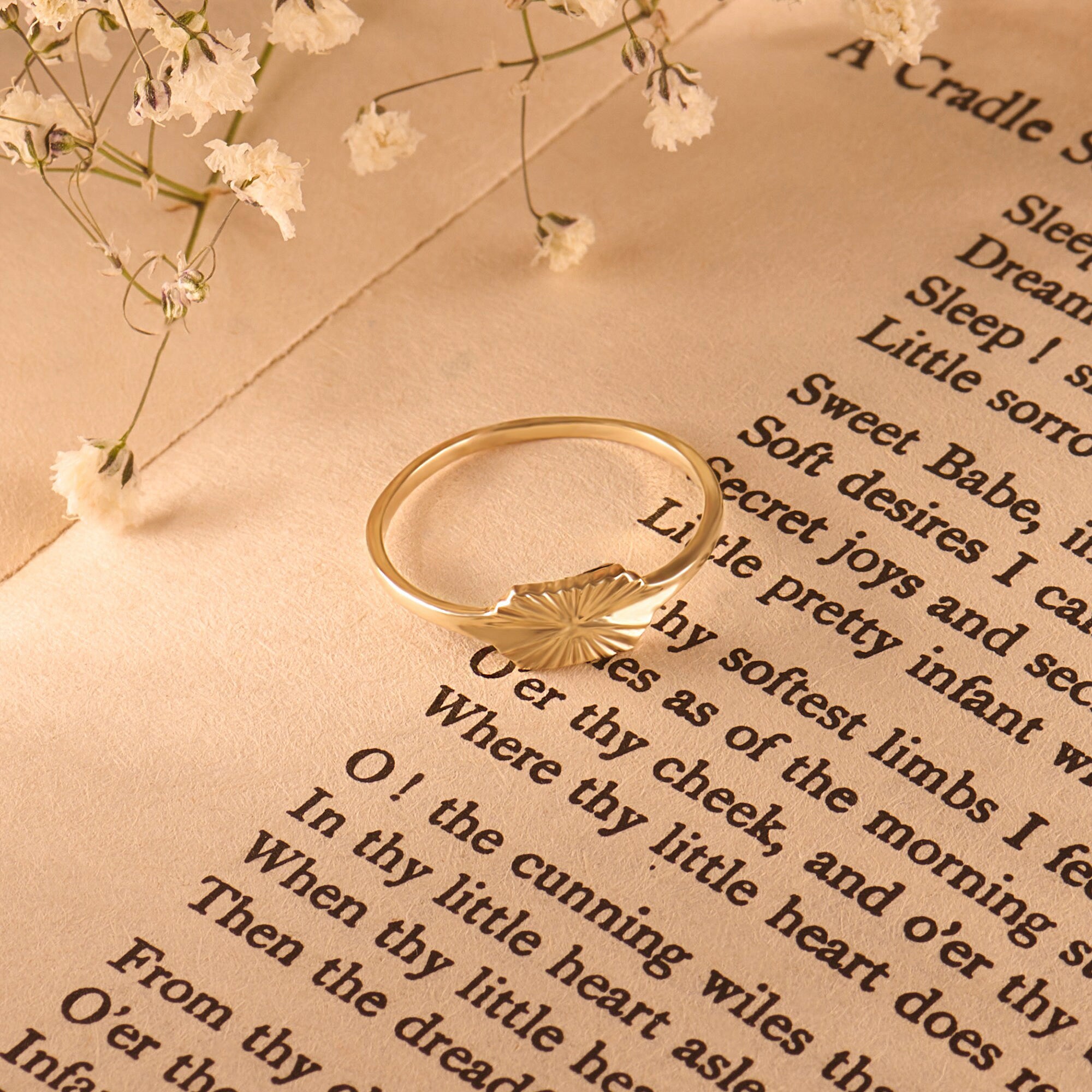 Craftsmanship: Precision sun engraving, smooth comfort-fit interior, slim signet shaping